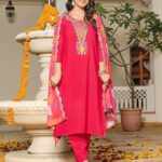 💖 Elegant Embroidered Tesla Kurta Pant Dupatta Set – Pink | Fully Stitched